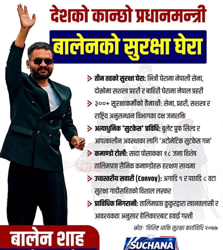 काठमाडौँ महानगरपालिकाका पुर्व मेयर तथा हुनेवाला प्रधानमन्त्री बालेन्द्र शाहले १३ गते प्रधानमन्त्रीको शपथ लेने कार्यक्रम रहेकाले उनको सुरक्षा व्यवस्थालाई लिएर कडा तयारी गरिएको छ। उनलाई ‘देशको कडा प्रधानमन्त्री’को रूपमा प्रस्तुत गर्दै उच्चस्तरीय सुरक्षा घेरा बनाइएको कुरा सार्वजनिक भएको छ।